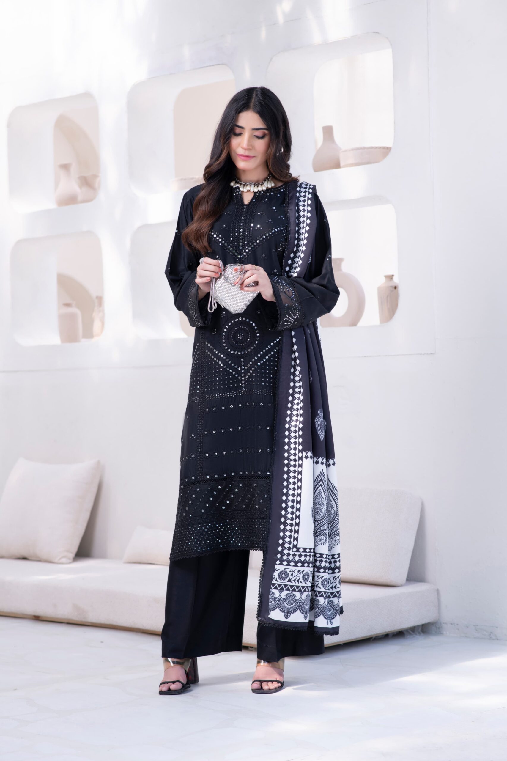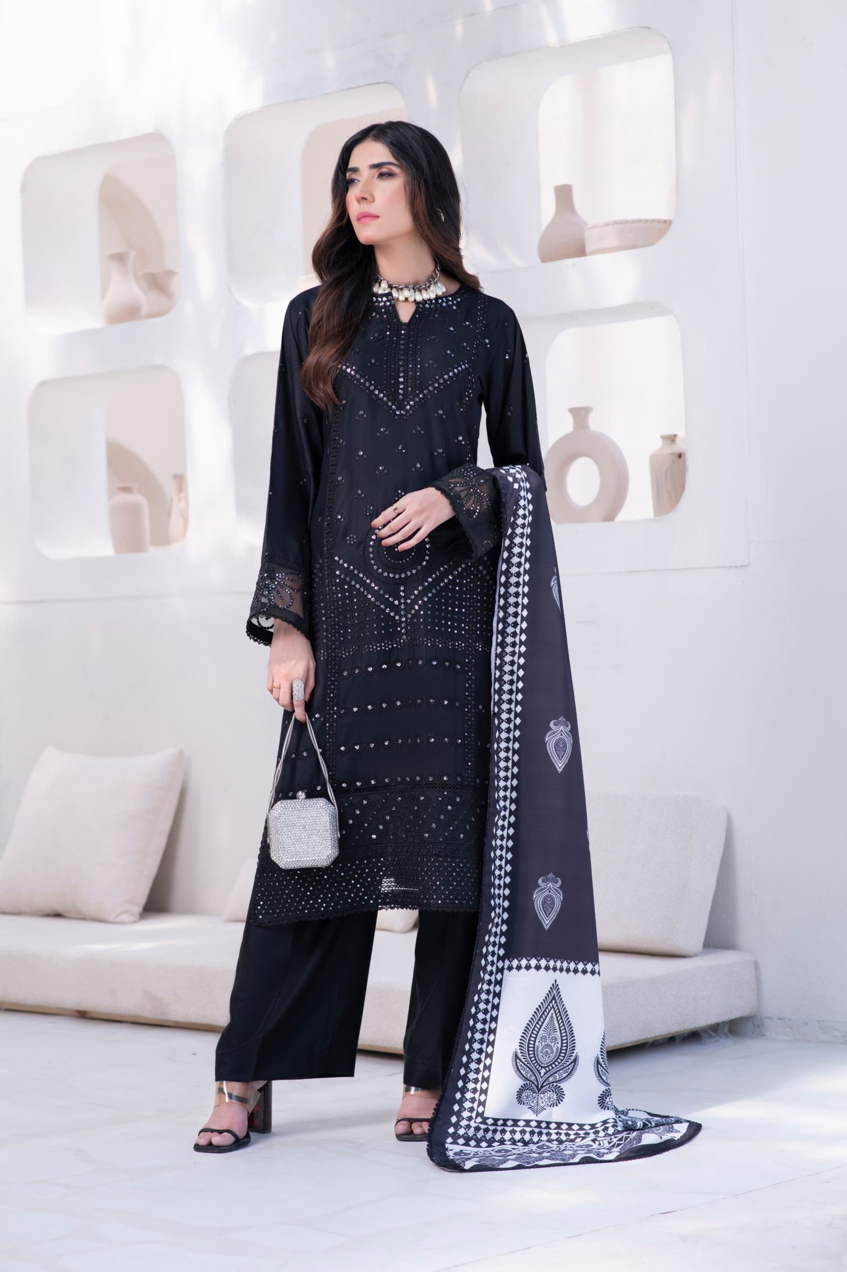 Paired with a printed Marina shawl, this stitched 3-piece exudes elegance, confidence, and festive charm — perfect for dinner gatherings or night soirées.