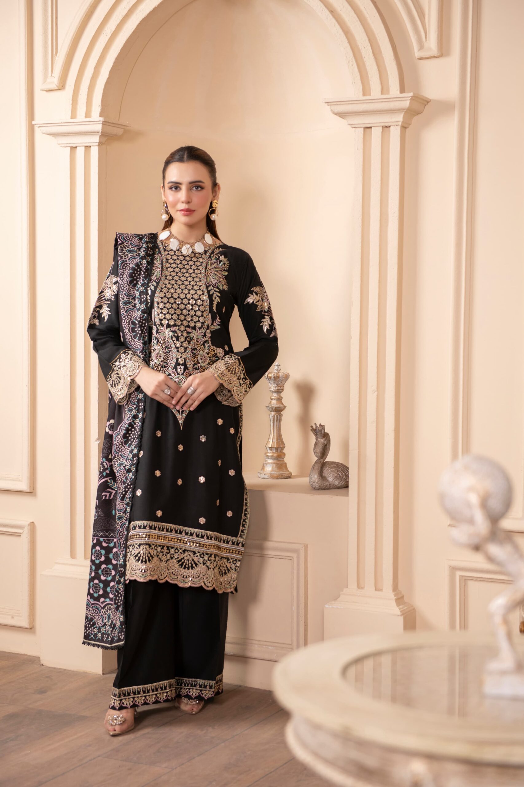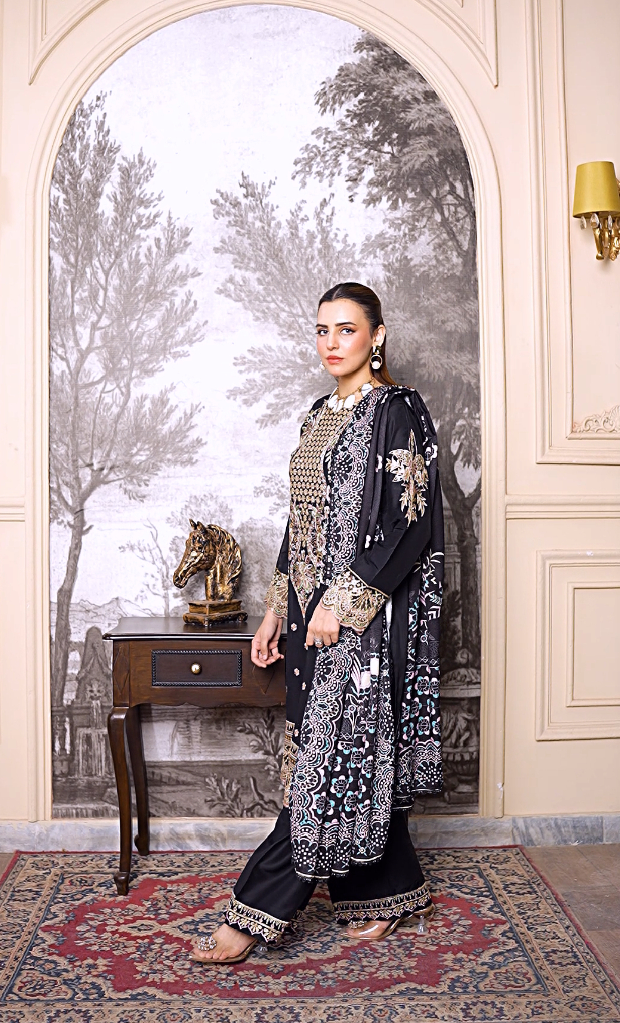Black Viscose 3-Piece — Golden Embroidered Royal Ensemble