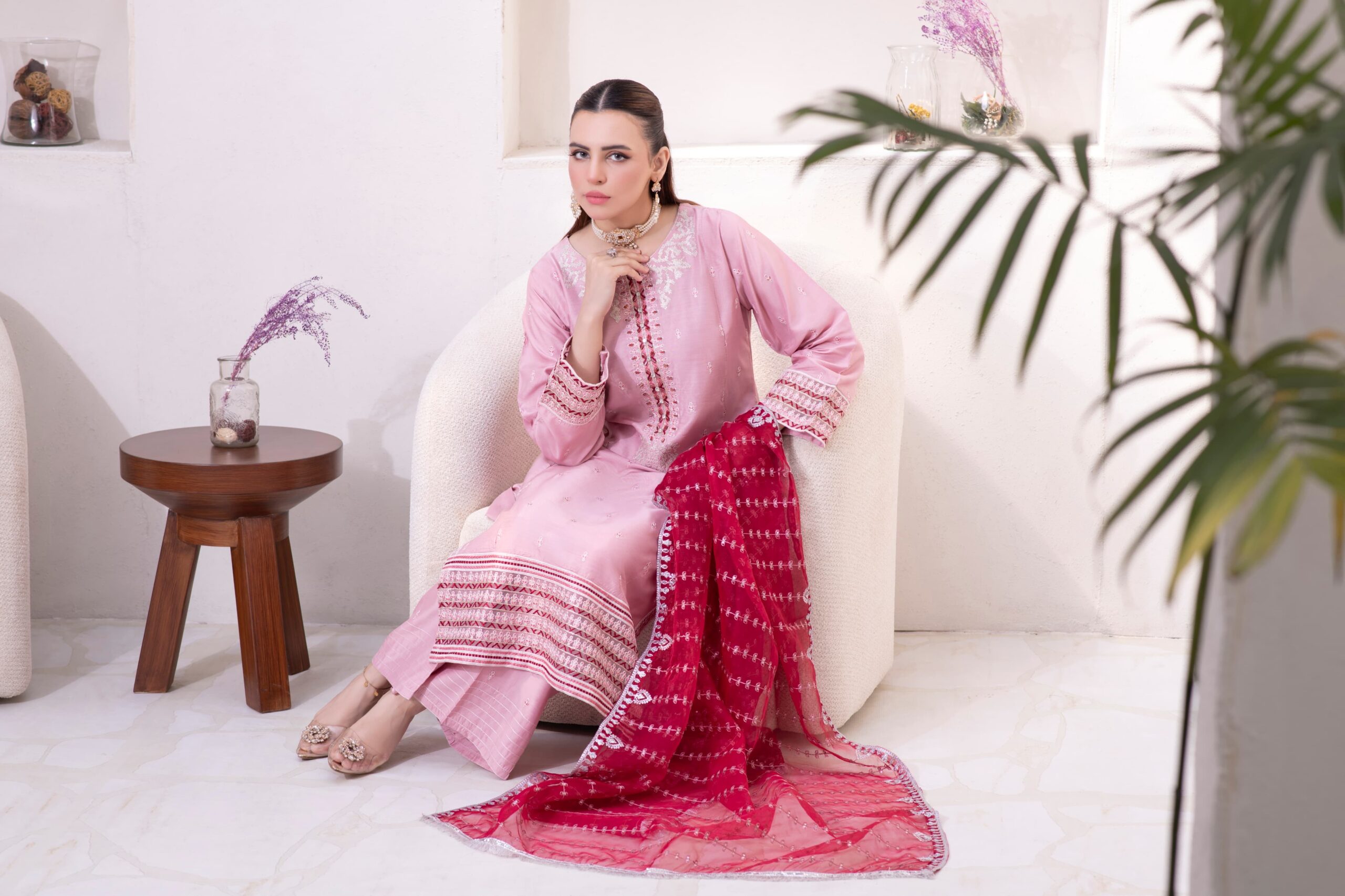 Clove Pink Viscose 3-Piece — Red & White Embroidered Elegance