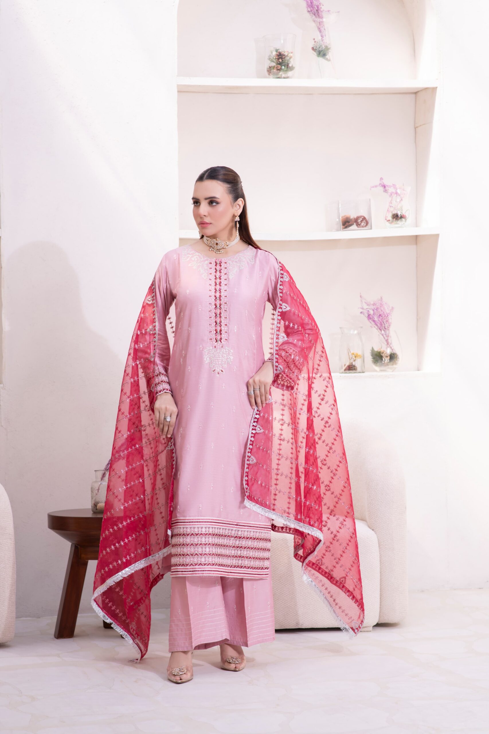 Paired with an embroidered organza dupatta that completes the look with sheer grace, this stitched 3-piece ensemble is perfect for every elegant occasion.
