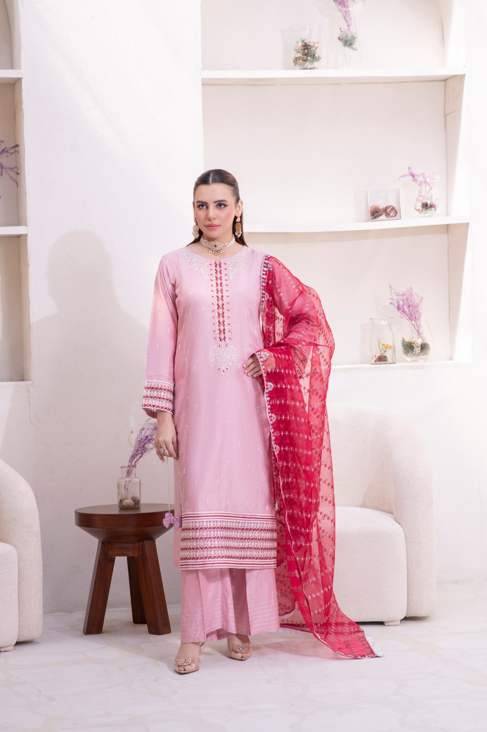 auto draftClove Pink Viscose 3-Piece — Red & White Embroidered Elegance