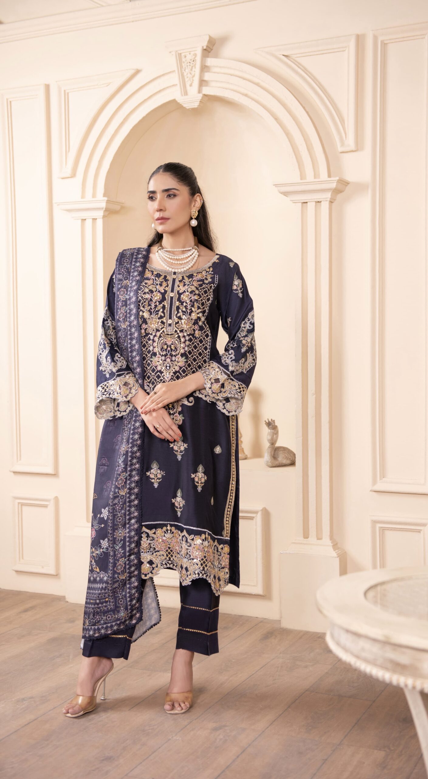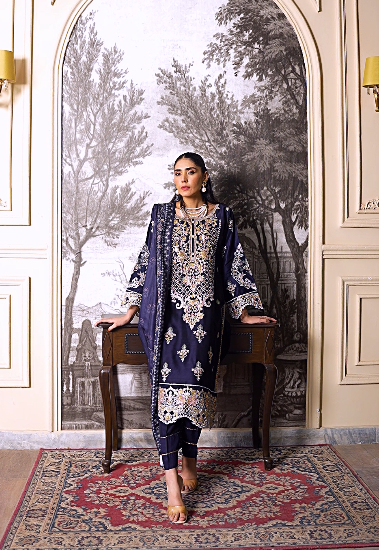 denim blue viscose 3 piece — timeless multi thread embroidered setDenim Blue Viscose 3-Piece — Timeless Multi-Thread Embroidered Set