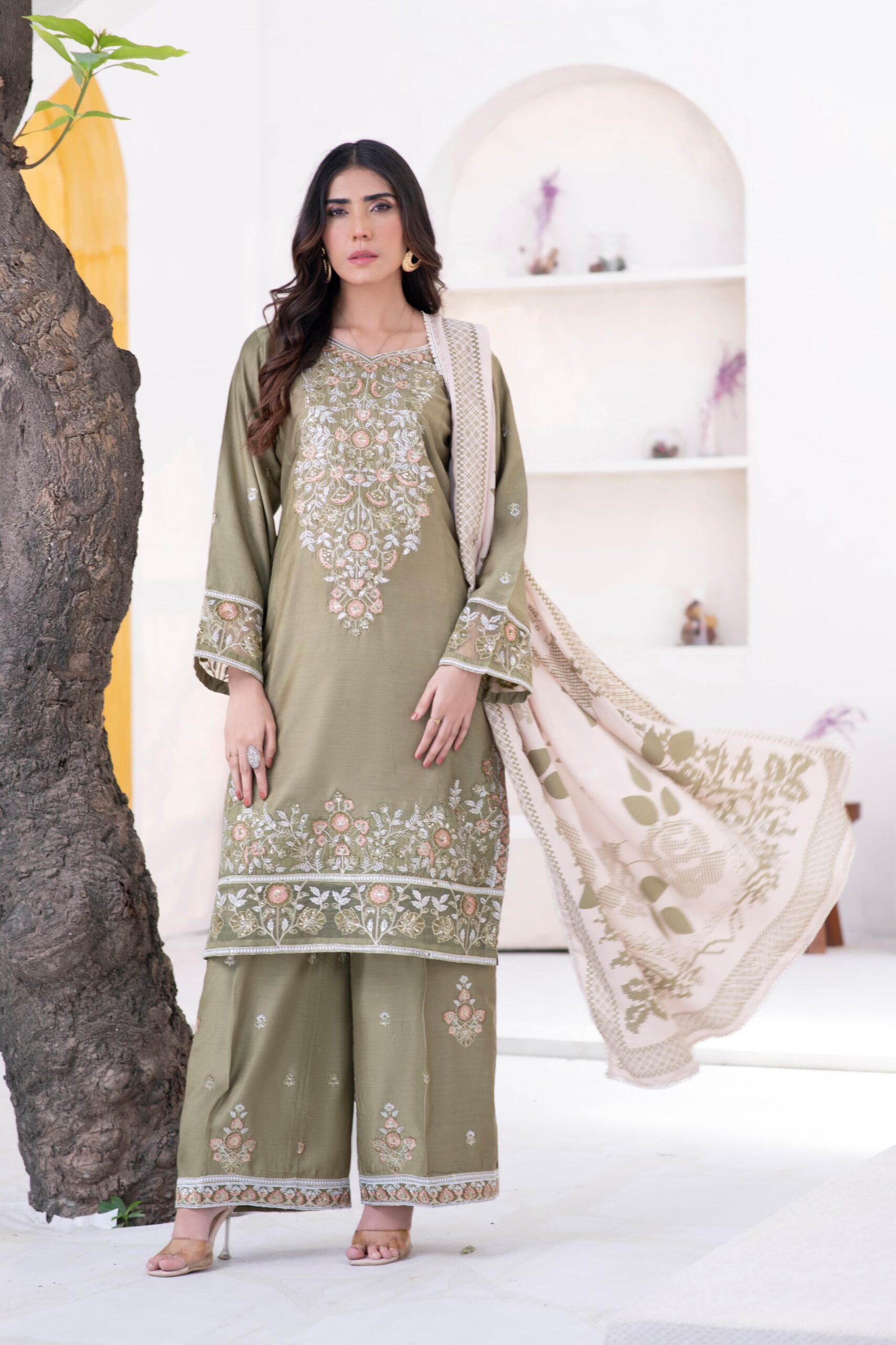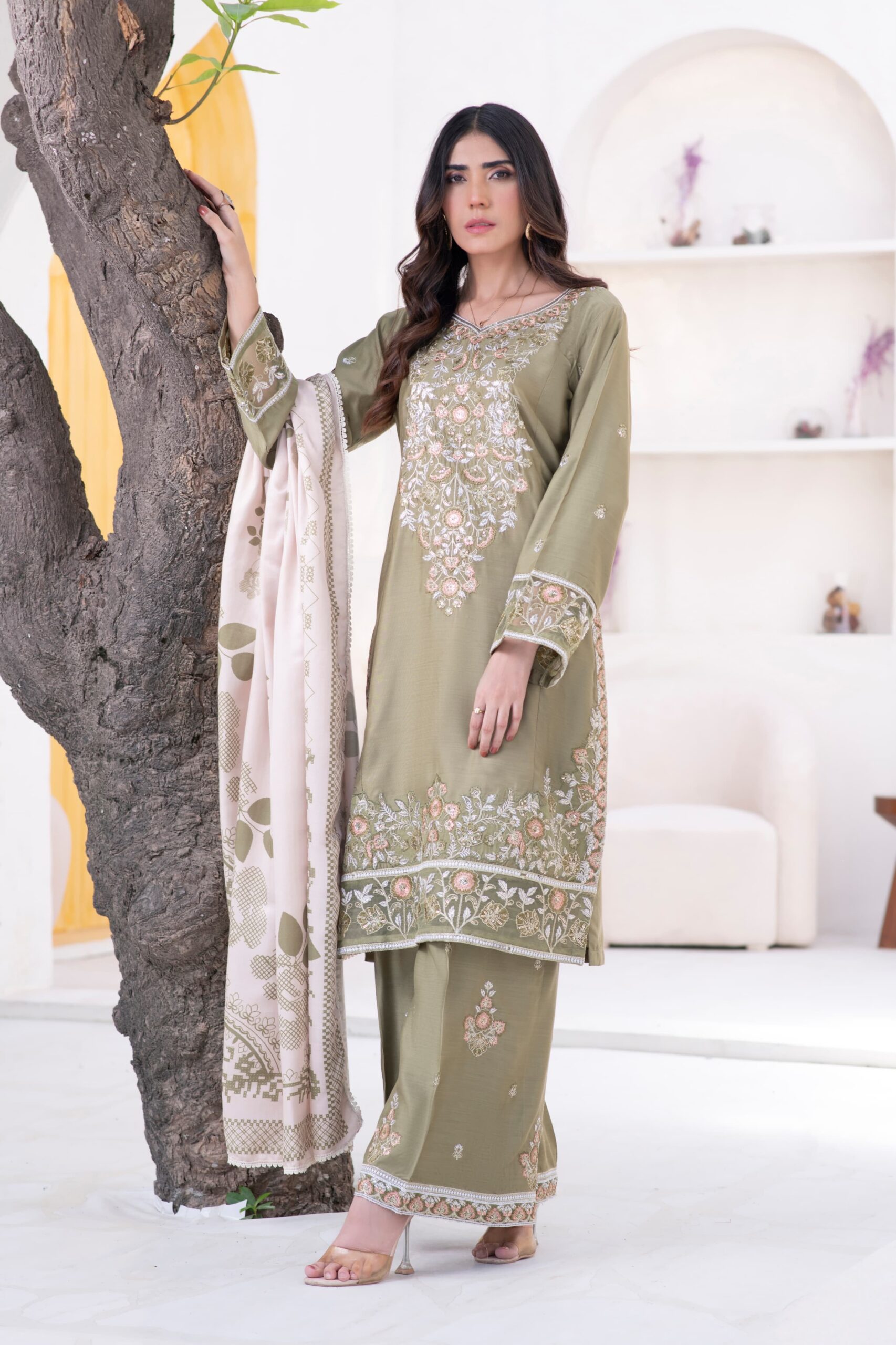 Paired with a cozy Marina shawl, this stitched 3-piece outfit combines winter comfort with timeless femininity — perfect for your festive gatherings and formal occasions.