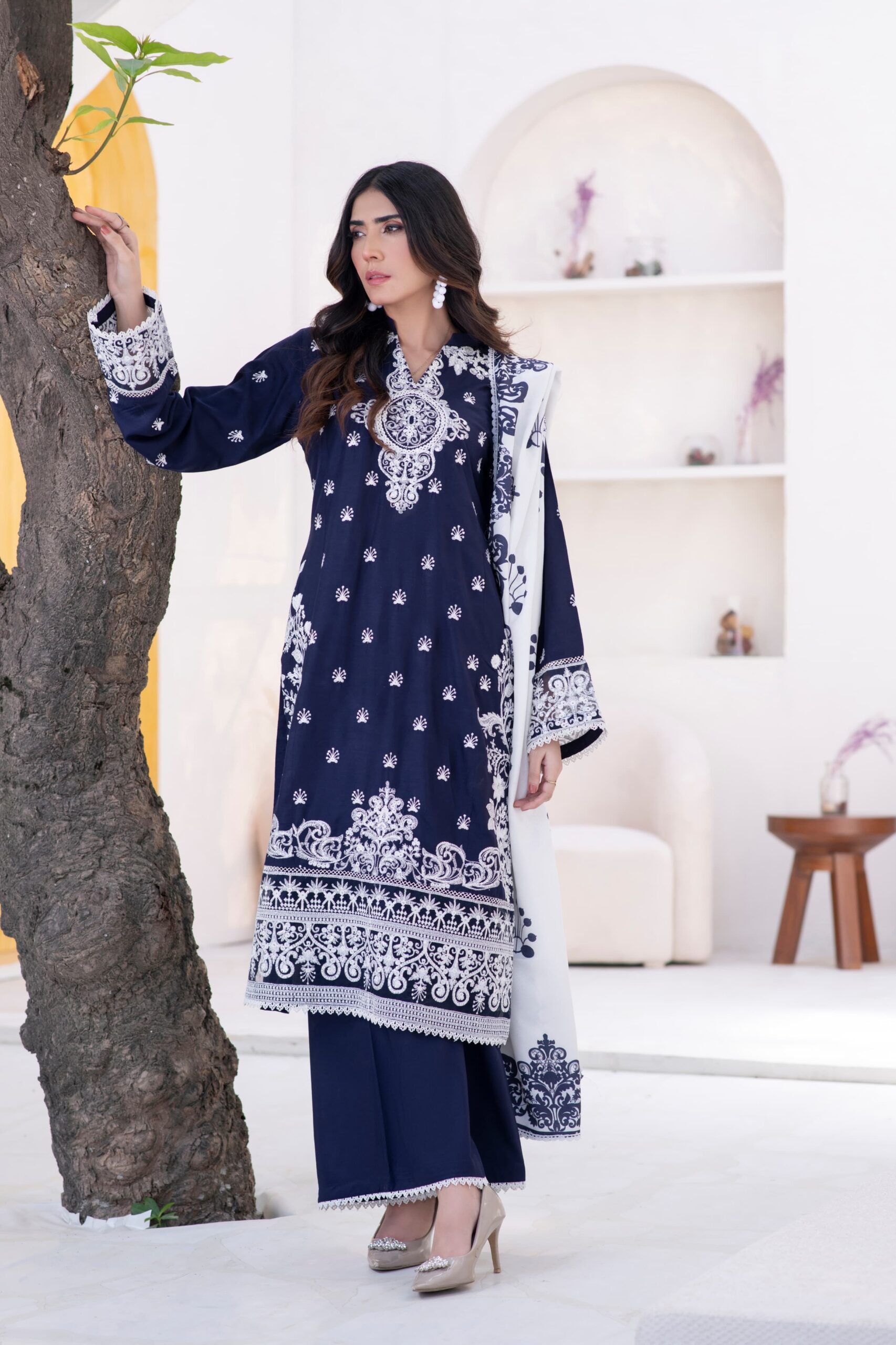 Intricate white embroidery adorns the shirt and borders, bringing a graceful contrast that stands out beautifully.