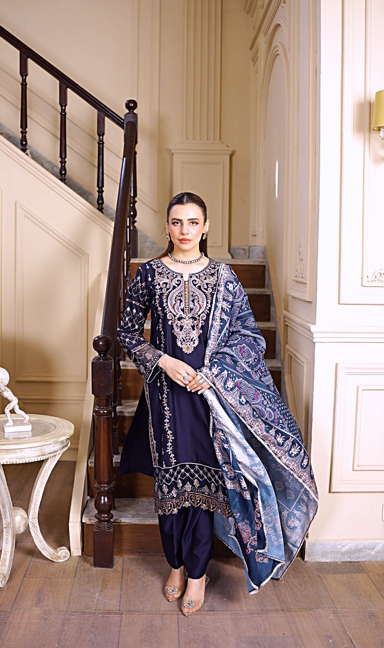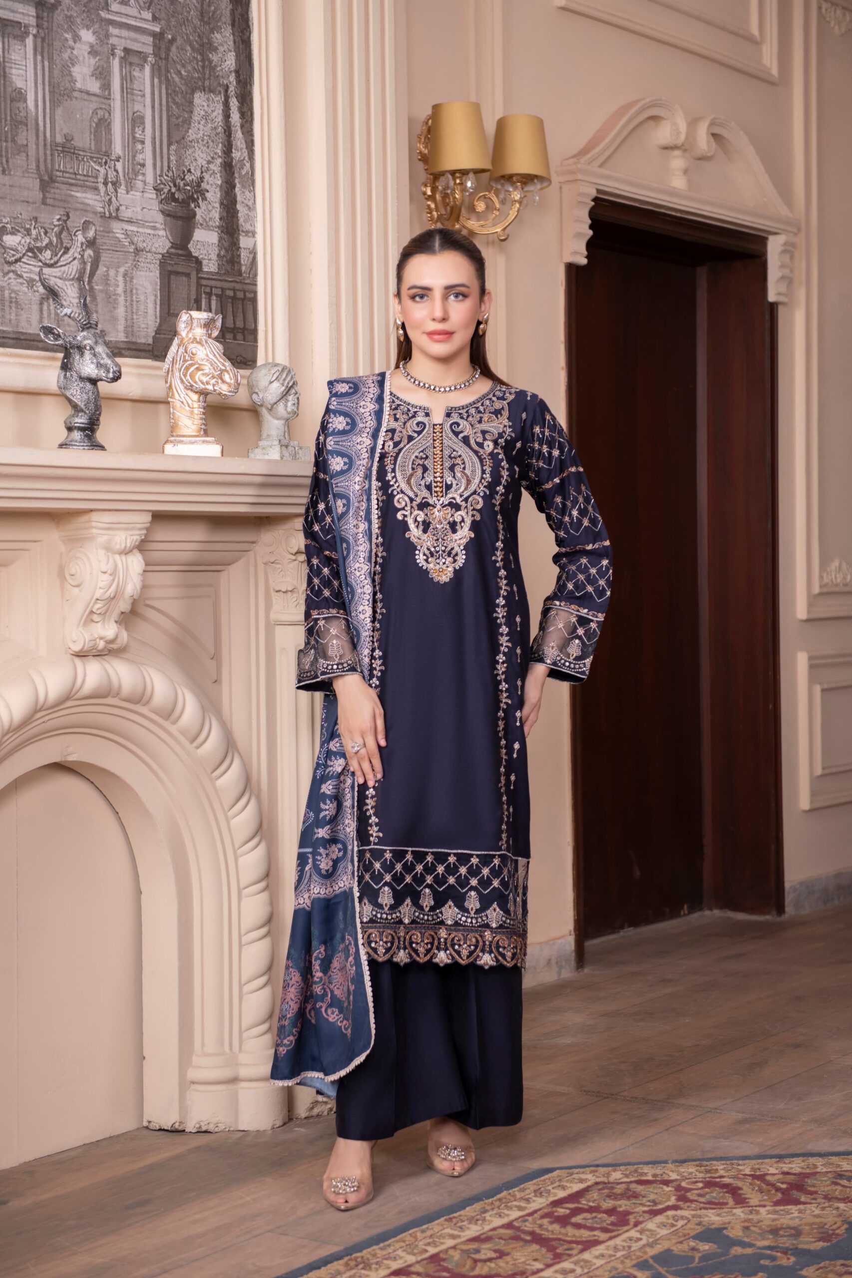 Be the first to review “Navy Blue Viscose 3-Piece — Golden & Beige Embroidered Winter Ensemble”