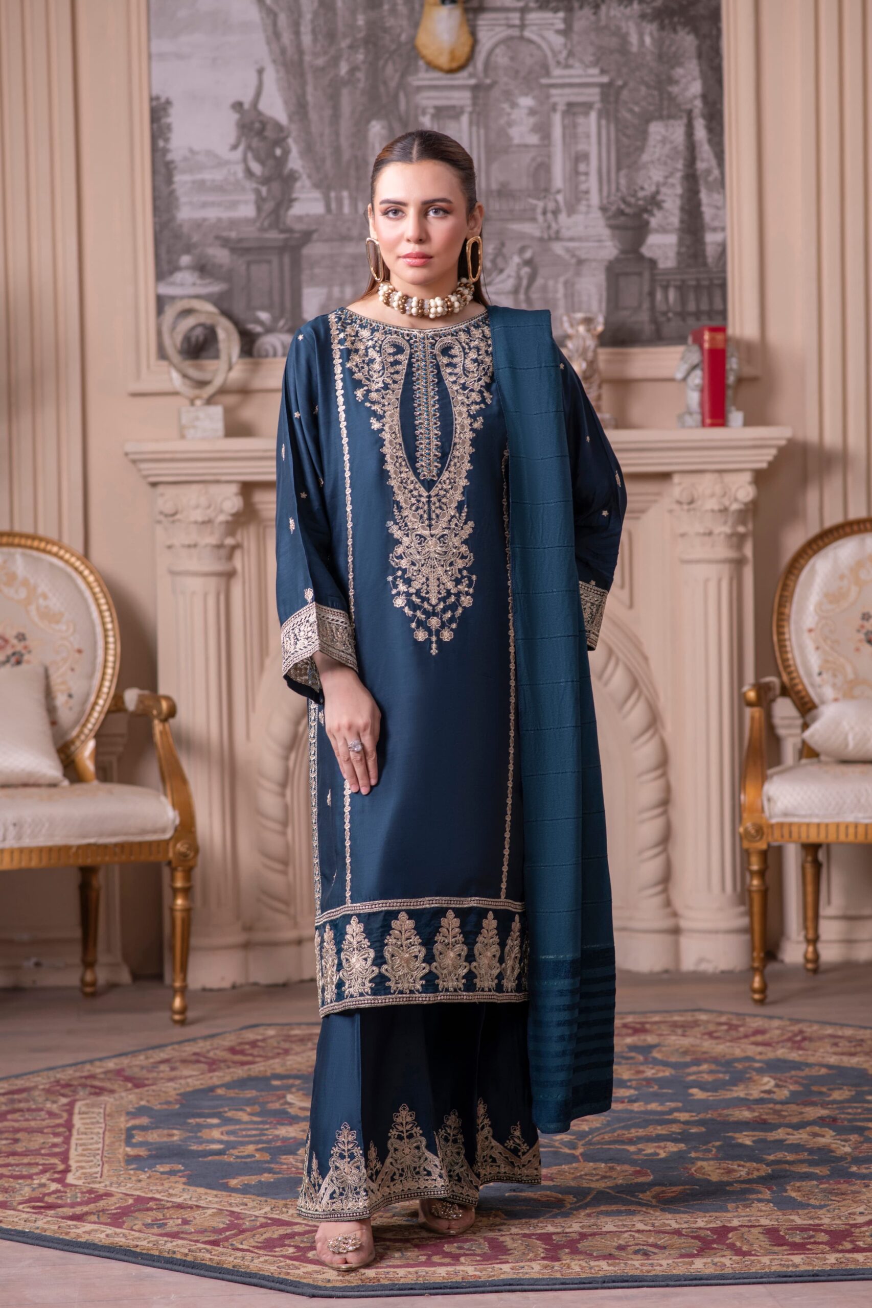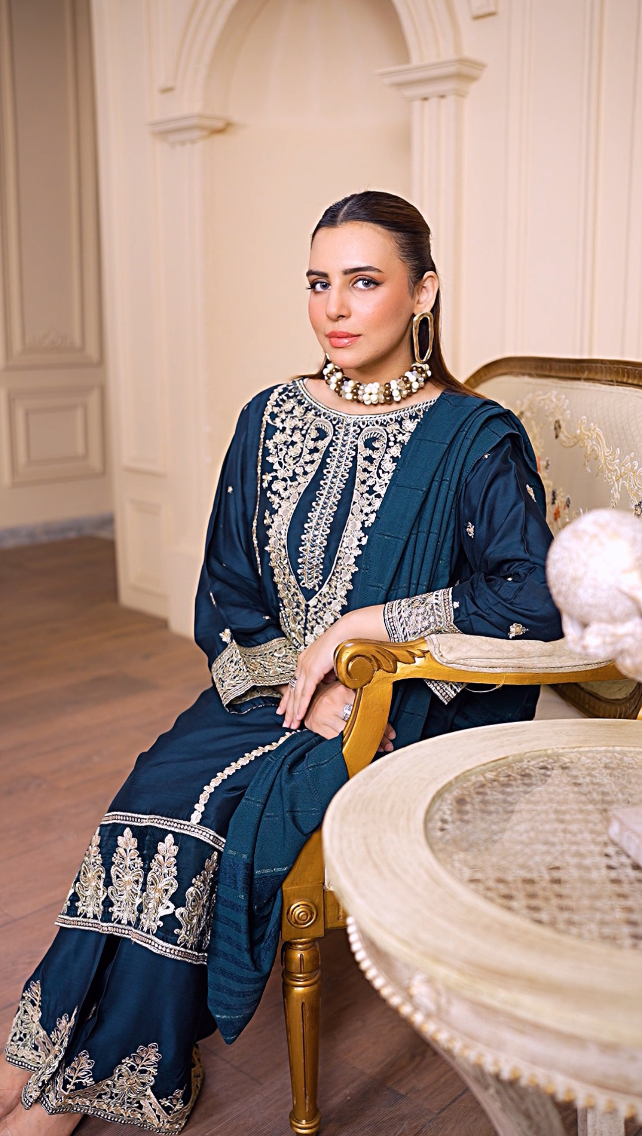Make an elegant statement this winter with this luxurious space-blue viscose outfit, featuring fine gold embroidery across the neckline, sleeves, and trouser borders.